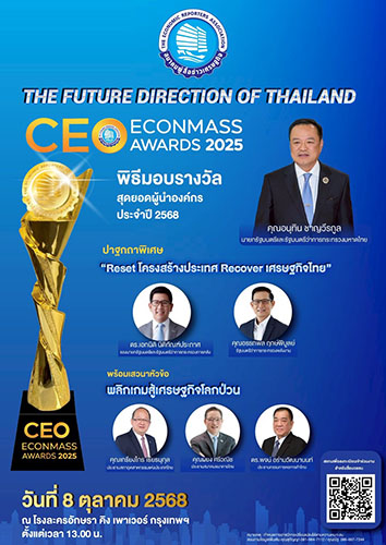 สำหรับงานมอบรางวัลสุดยอดผู้นำองค์กร “CEO Econmass Awards 2025” และงานสัมมนาใหญ่เศรษฐกิจไทย ประจำปี 2568 จะจัดขึ้นในวันที่ 8 ตุลาคม 2568 ณ โรงละครอักษรา คิง เพาเวอร์ กรุงเทพฯ ตั้งแต่เวลา 13.00 น.