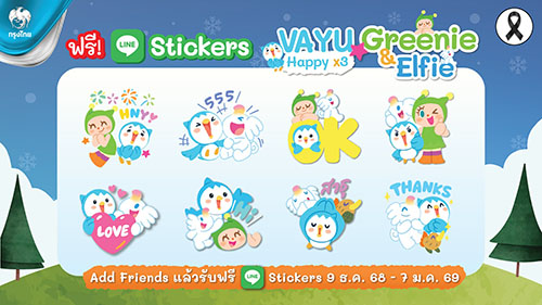 “Vayu × Greenie & Elfie : Happy x3”  เป็นอีกหนึ่งสื่อกลางในการเชื่อมต่อผู้คน และเสริมสร้างการมีส่วนร่วมกับ LINE KrungthaiCare มากยิ่งขึ้น ดาวน์โหลดฟรี เพียงเพิ่มเพื่อน @KrungthaiCare หรือ สามารถกดดาวน์โหลด https://line.me/S/sticker/36283 ตั้งแต่วันนี้ – 7 มกราคม 2569.