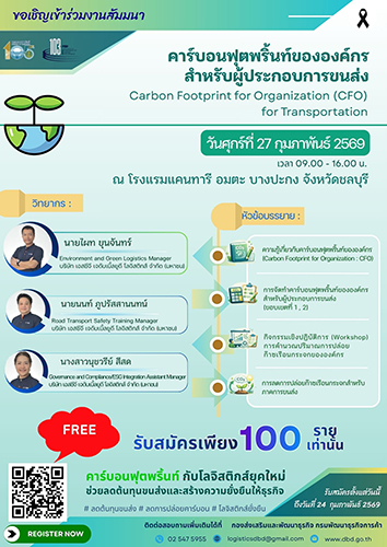 สำหรับหลักสูตรคาร์บอนฟุตพริ้นท์ขององค์กร สำหรับผู้ประกอบการขนส่ง Carbon Footprint for Organization (CFO) for Transportation ที่จะจัดขึ้นในวันศุกร์ที่ 27 กุมภาพันธ์ 2569 ณ โรงแรมแคนทารี อมตะ บางปะกง จังหวัดชลบุรี กรมฯ ได้เชิญผู้เชี่ยวชาญด้านการจัดการโลจิสติกส์ จากบริษัท เอสซีจี เจดับเบิ้ลยูดี โลจิสติกส์ จำกัด (มหาชน) มาร่วมให้ความรู้ แนวคิด และเครื่องมือที่สามารถนำไปใช้ได้จริง พร้อมกิจกรรมเชิงปฏิบัติการ (Workshop) เพื่อให้ผู้เข้าร่วมสัมมนาสามารถนำความรู้ที่ได้รับไปประยุกต์ใช้กับธุรกิจของตนเองให้สอดคล้องตามมาตรฐานสากล ทั้งนี้ กรมฯ มุ่งเน้นการถ่ายทอดความรู้เชิงปฏิบัติการ ตั้งแต่ความเข้าใจพื้นฐานเกี่ยวกับคาร์บอนฟุตพริ้นท์ขององค์กร วิธีการคำนวณและจัดเก็บข้อมูลการปล่อยก๊าซเรือนกระจกในภาคขนส่ง ตลอดจนแนวทางการปรับปรุงกระบวนการดำเนินงานเพื่อลดการใช้พลังงานและเชื้อเพลิง ลดต้นทุนด้านโลจิสติกส์ เพิ่มประสิทธิภาพการขนส่งอย่างเป็นระบบ และเตรียมความพร้อมรองรับมาตรการด้านสิ่งแวดล้อมทั้งในและต่างประเทศ ซึ่งจะช่วยเสริมสร้างภาพลักษณ์ที่ดี สร้างความเชื่อมั่นแก่คู่ค้าและผู้บริโภค ตลอดจนสนับสนุนเป้าหมายการพัฒนาที่ยั่งยืนของประเทศในระยะยาว