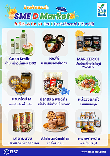 ธนาคารพัฒนาวิสาหกิจขนาดกลางและขนาดย่อมแห่งประเทศไทย (ธพว.) หรือ SME D Bank ขอเชิญชวนประชาชน ร่วมซื้อหาสินค้าดีจากผู้ประกอบการเอสเอ็มอีไทยทั่วประเทศ กระตุ้นเศรษฐกิจให้สุดคึกคัก ต้อนรับฤดูร้อนกับงาน “SME D Market” ประจำเดือนมีนาคม 2569 จัดระหว่างวันที่ 25-27 มีนาคม 2569 ณ หน้าอาคาร และชั้น 1 อาคาร SME Bank Tower (ติดรถไฟฟ้า BTS สถานีอารีย์) พบกับสินค้าอุปโภคบริโภค อาหาร เครื่องดื่ม และผลิตภัณฑ์คุณภาพหลากหลายประเภท ที่รวบรวมสินค้ามาไว้ครบในจุดเดียวมากกว่า 50 ร้านค้า