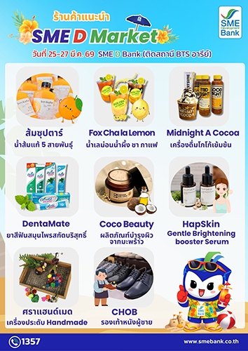 ทั้งนี้ SME D Bank จัดกิจกรรม SME D Market ขึ้นเป็นประจำทุกเดือน ต่อเนื่องยาวนานมาหลายปี เพื่อช่วยเหลือผู้ประกอบการเอสเอ็มอีที่ได้รับผลกระทบจากภาวะเศรษฐกิจ หรือวิกฤตต่างๆ ให้ได้รับโอกาสมาออกร้านจำหน่ายสินค้าโดยไม่เสียค่าใช้จ่าย ช่วยให้มีรายได้เพิ่ม แบรนด์เป็นที่รู้จัก และสินค้าเข้าถึงผู้บริโภคได้โดยตรง อีกทั้ง ยังมีส่วนช่วยกระตุ้นเศรษฐกิจภายในประเทศ โดยกิจกรรมนี้ ได้การตอบรับอย่างดียิ่งทั้งจากผู้ประกอบการ และประชาชน เพราะช่วยส่งเสริมให้ผู้ขายมีรายได้เพิ่ม ขณะเดียวกัน ช่วยสร้างคุณภาพชีวิตที่ดี นำไปสู่สังคมแห่งความสุข สร้างการเติบโตอย่างสมดุลและยั่งยืนทั้งเศรษฐกิจและสังคมไปพร้อมกัน.