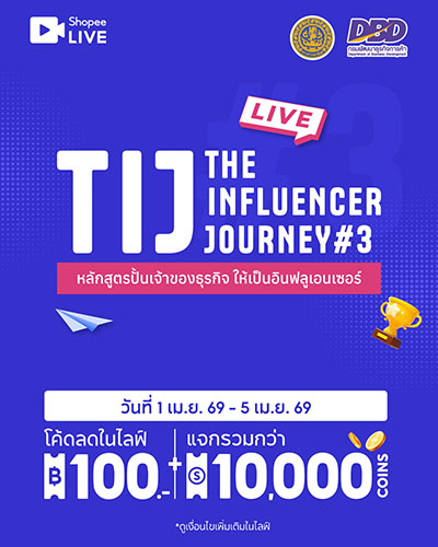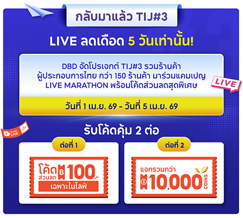 กรมพัฒนาธุรกิจการค้า จัดกิจกรรม LIVE Marathon รวม 150 ร้านค้าออนไลน์จากโครงการ TIJ#3 ไลฟ์ขายสินค้าผ่าน Shopee, TikTok และ NexGen Commerce ระหว่าง 1–10 เม.ย. 2569 พร้อมอัดโปรแรง คูปองส่วนลด–ส่งฟรี หวังกระตุ้นยอดขาย ขยายตลาดดิจิทัล และยกระดับผู้ประกอบการไทยสู่ยุคอินฟลูเอนเซอร์