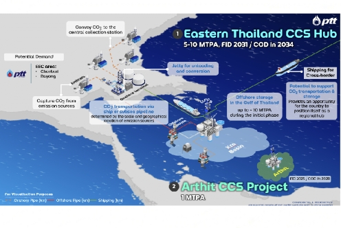 ในด้านการขับเคลื่อนความยั่งยืน ปตท. ยังคงมุ่งมั่นในการบรรลุเป้าหมาย Net Zero ภายในปี 2050 และจะลดการปล่อยก๊าซเรือนกระจกให้ได้ 15% ในปี 2035 โดยดำเนินการอย่างสมดุลในทุกมิติ ทั้ง เศรษฐกิจ สังคม และสิ่งแวดล้อม โดยหารือร่วมกับหน่วยงานภาครัฐ เพื่อกำหนดแนวทางส่งเสริมและผลักดันเทคโนโลยีดักจับและกักเก็บคาร์บอนไดออกไซด์ (CCS) ให้เกิดการใช้งานจริงในไทย พร้อมทั้งศึกษาและนำเสนอความเป็นไปได้ของการใช้ Hydrogen และ Ammonia Co-firing เป็นพลังงานทางเลือกในประเทศ ทั้งนี้ โครงการ CCS ที่แหล่งอาทิตย์ในอ่าวไทยจะเริ่มดักจับและกักเก็บคาร์บอนไดออกไซด์ในปี 2571 โดยสามารถกักเก็บได้สูงสุดประมาณ 1 ล้านตันต่อปี โครงการดังกล่าวจะเป็นต้นแบบสำคัญสำหรับการพัฒนา CCS ในพื้นที่อื่น ๆ ของประเทศไทย รวมถึงการพัฒนา CCS Hub ในเขตพัฒนาพิเศษภาคตะวันออกในอนาคต