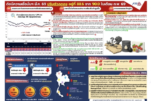 นายนาวา จันทนสุรคน รองประธานสภาอุตสาหกรรมแห่งประเทศไทย (ส.อ.ท.) พร้อมด้วย นางบัญชุสา พุทธพรมงคล กรรมการ ส.อ.ท. และรองประธานสายงานเศรษฐกิจและวิชาการ ส.อ.ท. ร่วมเปิดเผยผลการสำรวจดัชนีความเชื่อมั่นภาคอุตสาหกรรม ประจำเดือนมีนาคม 2569 อยู่ที่ระดับ 88.6 ปรับตัวลดลงจากระดับ 90.0 ในเดือนกุมภาพันธ์ 2569