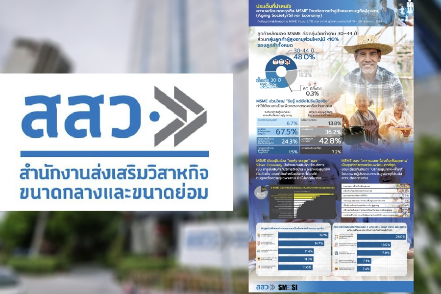 นางสาวปณิตา ชินวัตร รองผู้อำนวยการรักษาการแทนผู้อำนวยการสำนักงานส่งเสริมวิสาหกิจขนาดกลางและขนาดย่อม เปิดเผยผลสำรวจความคิดเห็นผู้ประกอบการ SME เกี่ยวกับความพร้อมของธุรกิจต่อการเข้าสู่สังคมผู้สูงอายุ (Aging Society/Silver Economy) โดยเก็บข้อมูลจากผู้ประกอบการ SME จำนวน 2,712 ราย จาก 6 ภูมิภาค ระหว่างวันที่ 19–29 สิงหาคม 2568 พบว่า ปัจจุบัน SME เริ่มมีการจ้างงานผู้สูงอายุเฉลี่ยอยู่ที่ร้อยละ 11 โดยเฉพาะภาคธุรกิจการเกษตรมีสัดส่วนการจ้างงานสูงสุดอยู่ที่ร้อยละ 17 และธุรกิจขนาดกลางมีแนวโน้มจ้างงานผู้สูงอายุมากกว่าธุรกิจรายย่อย (Micro)