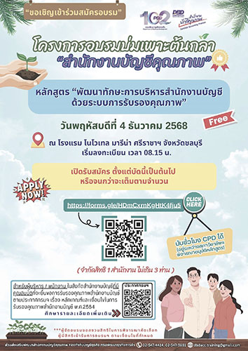 เพื่อเป็นการพัฒนาสำนักงานบัญชีและผู้ประกอบวิชาชีพบัญชีให้มีความรู้ความเข้าใจเกี่ยวกับข้อกำหนดการรับรองคุณภาพสำนักงานบัญชี รวมทั้งองค์ความรู้ต่างๆ ที่จำเป็นในการดำเนินธุรกิจ กรมฯ จึงได้จัดทำโครงการอบรมบ่มเพาะต้นกล้าสำนักงานบัญชีคุณภาพ ประจำปีงบประมาณ 2569 โดยเป็นการอบรมให้ความรู้ในรูปแบบการบรรยาย แบ่งกลุ่มฝึกปฏิบัติ (Workshop) และนำเสนอผลงานรวม 7 ชั่วโมง และสามารถนับเป็นชั่วโมง CPD ได้ด้วย กำหนดจัดอบรมในวันที่ 4 ธันวาคม 2568 ณ โรงแรม โนโวเทล มาริน่า ศรีราชาฯ จังหวัดชลบุรี โดยมีเนื้อหาเกี่ยวกับ 1) ประกาศกรมพัฒนาธุรกิจการค้า เรื่อง หลักเกณฑ์และเงื่อนไขในการรับรองคุณภาพสำนักงานบัญชี พ.ศ. 2564 และเทคนิคการบริหารสำนักงานบัญชี ด้วยระบบการรับรองคุณภาพ โดยวิทยากรจากภาครัฐ จำนวน 1 ชั่วโมง 2) การบรรยายเกี่ยวกับข้อกำหนดการรับรองคุณภาพสำนักงานบัญชีและแบ่งกลุ่มฝึกปฏิบัติ (Workshop) แนวทางการเขียนคู่มือการดำเนินงานสำนักงานบัญชีคุณภาพ และเทคนิคการประยุกต์ ISO 9001 สู่ข้อกำหนดการรับรองคุณภาพสำนักงานบัญชี โดยวิทยากรจากภาคเอกชน จำนวน 6 ชั่วโมง