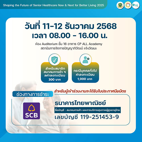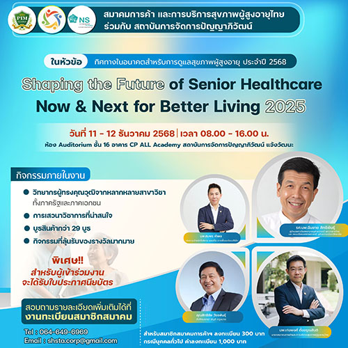 นายพูนพงษ์ นัยนาภากรณ์ อธิบดีกรมพัฒนาธุรกิจการค้า กระทรวงพาณิชย์ เปิดเผยว่า กรมพัฒนาธุรกิจการค้า สมาคมการค้าและการบริการสุขภาพผู้สูงอายุไทย (SHSTA) และสถาบันการจัดการปัญญาภิวัฒน์ เตรียมจัดงานเสวนาวิชาการ ‘Shaping the Future of Senior Healthcare: Now & Next for Better Living 2025’ ระหว่างวันที่ 11 – 12 ธันวาคม 2568 ณ ห้อง Auditorium สถาบันการจัดการปัญญาภิวัฒน์ ถ.แจ้งวัฒนะ เพื่อใช้เป็นเวทีแลกเปลี่ยนองค์ความรู้ด้านการแพทย์ เทคโนโลยี นวัตกรรมการดูแลผู้สูงอายุ และการพัฒนาธุรกิจบริการสุขภาพ นอกจากนี้ จะมีการจัดนิทรรศการแสดงนวัตกรรมและการสร้างเครือข่ายธุรกิจด้านสุขภาพทั่วประเทศ เพื่อให้ผู้เข้าร่วมงานได้เห็นถึงนวัตกรรมที่จะสามารถนำมาช่วยต่อยอดระบบบริหารจัดการธุรกิจ และแสดงถึงความทันสมัยของเทคโนโลยี และ Age Tech ที่จะนำมาเป็นผู้ช่วยในการดูแลผู้สูงอายุได้อย่างถูกต้องตามหลักการแพทย์ และเหมาะสมกับสรีระศาสตร์ของผู้สูงอายุแต่ละช่วงวัย/แต่ละคน ซึ่งจะช่วยให้การดูแลผู้สูงอายุมีประสิทธิภาพเพิ่มมากขึ้น ตอบโจทย์ความต้องการของผู้รับบริการ (ผู้สูงอายุ) และสนองความคาดหวังของลูกหลานที่ต้องการการบริการที่ดี ช่วยอำนวยความสะดวกแก่บุพการีในช่วงบั้นปลายอย่างมีความสุขและถูกต้องตามหลักสากล