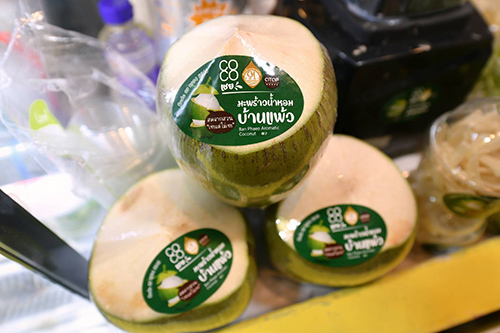 ปิดท้ายด้วยเมนูจาก มะพร้าวน้ำหอมบ้านแพ้ว GI จังหวัดสมุทรสาคร ซึ่งมีจุดเด่นอยู่ที่เนื้อมะพร้าวเหนียวนุ่ม น้ำมะพร้าวรสชาติหวาน พร้อมกลิ่นหอมคล้ายใบเตย ถูกนำมารังสรรค์เป็นเมนูยอดนิยม ทั้งพุดดิ้งมะพร้าวอ่อน ทองม้วนไส้มะพร้าว และน้ำมะพร้าว เมนูที่ได้รับความนิยมและขายดีที่สุด คือ น้ำมะพร้าว และ พุดดิ้งมะพร้าวอ่อน โดยสภาพอากาศที่เปลี่ยนแปลงในช่วงปลายฝนต้นหนาวนี้ส่งผลต่อรสชาติของน้ำมะพร้าวโดยตรง โดยมีความหวานหอมอร่อยเป็นเอกลักษณ์ เมื่อนำมาทำเมนูพุดดิ้งมะพร้าวอ่อนก็จะมีความหวานละมุนของมะพร้าวตามธรรมชาติโดยไม่ต้องใส่น้ำตาลหรือสารเพิ่มความหวานอีก ทั้งนี้ มะพร้าวน้ำหอมบ้านแพ้วสามารถทำรายได้ในงานไปได้กว่า 1.5 แสนบาท