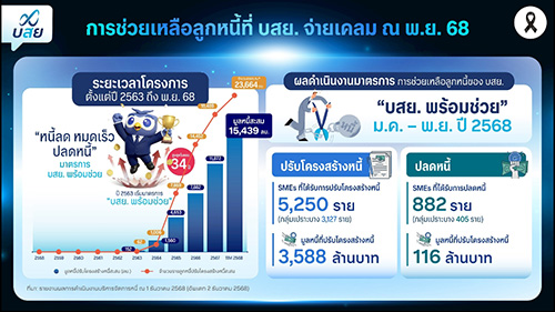 บสย. ยังประสบความสำเร็จในการช่วยเหลือ SMEs ลูกหนี้ที่ บสย. จ่ายเคลม ผ่านมาตรการ “บสย. พร้อมช่วย” หรือ มาตรการ 3 สี (ม่วง เหลือง เขียว) โดยตั้งแต่ออกมาตรการในปี 2565 ถึงปัจจุบัน สามารถช่วยลูกหนี้ที่ถูกจ่ายเคลมไปแล้วถึง 23,664 ราย คิดเป็นมูลหนี้สะสม 15,439 ล้านบาท (เฉพาะ ม.ค. – พ.ย. 2568 ปรับโครงสร้างหนี้ 5,250 ราย คิดเป็นมูลหนี้ 3,588 ล้านบาท) และสามารถช่วยลูกหนี้ “ปลดหนี้” 882 ราย เกือบ 50% เป็นกลุ่มเปราะบาง เงินต้นไม่เกิน 2 แสนบาท สูงสุดเป็นประวัติการณ์ในรอบ 34 ปี นับตั้งแต่ก่อตั้ง บสย.