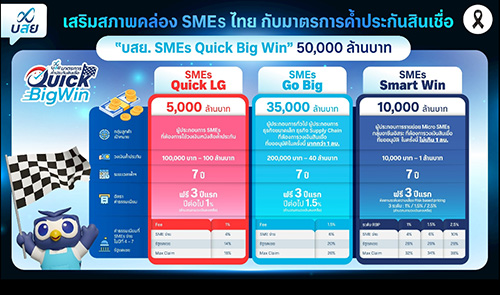 จากสภาพดังกล่าวเป็นที่มาของนโยบายของรัฐบาล โดยกระทรวงการคลัง เปิดตัว มาตรการค้ำประกันสินเชื่อ “บสย. Quick Big Win” วงเงินค้ำประกัน 50,000 ล้านบาท จากมติคณะรัฐมนตรีเมื่อวันที่ 2 ธันวาคม 2568 เพื่อเติมสภาพคล่องให้ SMEs อย่างเร่งด่วน ประกอบด้วย 3 โครงการหลัก ตามประเภทของ SMEs ได้แก่