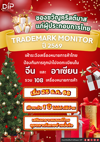 สำหรับโครงการ Trademark Monitor ในปี 2569 กรมฯ ได้เริ่มเปิดรับสมัครผู้ประกอบการ SMEs เข้าร่วมโครงการตั้งแต่ช่วงกลางเดือนพฤศจิกายน 2568 โดยมีผู้ให้ความสนใจสมัครเข้าร่วมโครงการทั้งสิ้น 132 ราย และกรมฯ ได้ประกาศรายชื่อผู้ที่เข้าหลักเกณฑ์และได้รับคัดเลือกให้เข้าร่วมโครงการจำนวน 108 ราย ซึ่งเป็นผู้ประกอบการที่มีคำขอเครื่องหมายการค้าที่อยู่ระหว่างยื่นจดทะเบียนในไทย หรือได้รับจดทะเบียนเรียบร้อยแล้ว รวมทั้งมีแผนที่จะขยายตลาดหรือเคยส่งออกสินค้าภายใต้เครื่องหมายดังกล่าวไปยังจีนและอาเซียน ซึ่งเป็นประเทศเป้าหมายตามโครงการ โดยกรมฯ จะเริ่มดำเนินการเฝ้าระวังการนำเครื่องหมายการค้าของ SMEs ทั้ง 108 ราย ไปยื่นจดทะเบียนในจีนและอาเซียน ตั้งแต่วันที่ 25 ธันวาคม 2568 และต่อเนื่องเป็นระยะเวลา 1 ปีเต็ม โดยไม่มีค่าใช้จ่าย เพื่อมอบเป็นของขวัญแห่งช่วงเวลาพิเศษในเทศกาลคริสต์มาสให้แก่ผู้ประกอบการไทย ทั้งนี้ กรมฯ จะเพิ่มความเข้มงวดในการติดตามเฝ้าระวัง โดยจะมีการตรวจสอบทั้งในมิติของการนำเครื่องหมายการค้าไทยไปจดทะเบียนโดยไม่สุจริต (Bad-Faith Filing) และการจดเครื่องหมายเลียนแบบ ซึ่งล้วนส่งผลกระทบต่อการทำตลาดในต่างประเทศของผู้ประกอบการไทยเป็นอย่างมาก