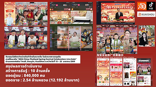 สำหรับการถ่ายทอดสดจำหน่ายสินค้าไทย กรมฯ ได้เชิญ KOL เข้าร่วมดำเนินกิจกรรมบนแพลตฟอร์มหลักทั้ง 3 แพลตฟอร์ม เช่น Douyin KOL : Wei San ผู้ติดตาม 12.904 ล้านคน, Zhou Xiaozhen ผู้ติดตาม 1.718 ล้านคนTmall KOL : Mi feng huan le she ผู้ติดตาม 6.254 ล้านคน และ Kuaishou KOL : Xiao yuan bu tai yuan ผู้ติดตาม 0.916 ล้านคน เป็นต้น โดยจัดการถ่ายทอดสดอย่างต่อเนื่องเป็นระยะเวลา 10 วัน ระหว่างวันที่ 15–25 มกราคม 2569 ซึ่งได้รับความสนใจจากผู้บริโภคชาวจีนเป็นจำนวนมาก บรรยากาศการจำหน่ายเป็นไปอย่างคึกคัก ส่งผลให้เกิดการตัดสินใจสั่งซื้อสินค้าไทยในระดับสูง
