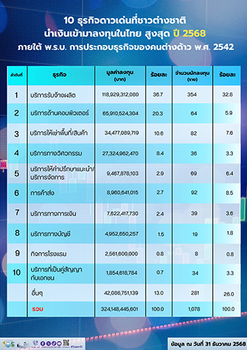 สำหรับธุรกิจที่นักลงทุนชาวต่างชาติให้ความสนใจนำเงินเข้ามาลงทุนในประเทศไทยสูงสุด 10 อันดับแรก ภายใต้ พ.ร.บ. การประกอบธุรกิจของคนต่างด้าว พ.ศ. 2542 มีมูลค่าการลงทุนรวมกว่า 2.82 แสนล้านบาท คิดเป็น 87.0% ของการลงทุนทั้งหมด (ลงทุนรวมทั้งปี 2568 จำนวน 3.24 แสนล้านบาท) โดยเป็นการลงทุนจากนักลงทุนประเทศต่างๆ รวม 797 ราย คิดเป็น 74.0% ของนักลงทุนทั้งหมด (นักลงทุนชาวต่างชาติ รวมทั้งปี 2568 จำนวน 1,078 ราย) โดยประเภทธุรกิจที่นักลงทุนชาวต่างชาติสนใจที่เข้ามาลงทุนสูงสุด 10 อันดับแรก ได้แก่