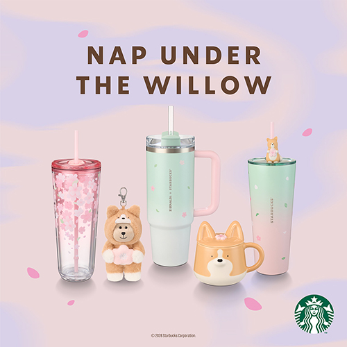 คอลเลกชันดริ๊งก์แวร์ Nap Under The Willow ถ่ายทอดความอบอุ่นผ่านเรื่องราวของสุนัขพันธุ์คอร์กี้แสนน่ารักที่กำลังงีบหลับอย่างผ่อนคลายใต้ร่มไม้ โดดเด่นด้วยโทนสีชมพูเสริมด้วยสีเขียวพาสเทล พร้อมลวดลายกลีบดอกซากุระปลิวไหว ให้ความรู้สึกอ่อนโยนและชวนให้รู้สึกผ่อนคลาย