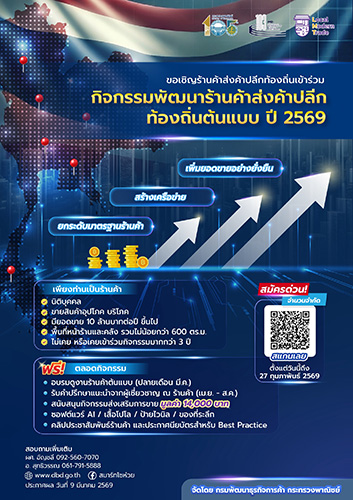 ขอเชิญชวนผู้ประกอบการร้านค้าส่งค้าปลีกท้องถิ่นที่จดทะเบียนนิติบุคคล จำหน่ายสินค้าอุปโภคบริโภค มียอดขายไม่ต่ำกว่า 10 ล้านบาทต่อปี และมีพื้นที่หน้าร้านรวมคลังสินค้าไม่น้อยกว่า 600 ตารางเมตร ทั้งนี้ ต้องเป็นผู้ประกอบการที่ไม่เคยหรือเคยเข้าร่วมกิจกรรม มากกว่า 3 ปีขึ้นไป สมัครเข้าร่วมกิจกรรมพัฒนาร้านค้าส่งค้าปลีกท้องถิ่นต้นแบบ ปี 2569 เพื่อยกระดับมาตรฐานร้านค้า สร้างเครือข่าย และเพิ่มยอดขายอย่างยั่งยืน นอกจากนี้ ยังได้รับสิทธิพิเศษอื่นๆ อีกมากมาย อาทิ ซอฟแวร์ AI ประกาศนียบัตร คลิปประชาสัมพันธ์ร้านค้าสำหรับ Best Practice รวมถึงโอกาสในการเข้าถึงแหล่งเงินทุนจากสถาบันการเงินชั้นนำ การเข้าร่วมกิจกรรมเชื่อมโยงเครือข่ายและสร้างโอกาสทางการตลาด