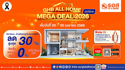 ธนาคารอาคารสงเคราะห์ (ธอส.) สนับสนุนคนไทยมีที่อยู่อาศัยเป็นของตนเองได้ง่ายมากขึ้นในราคาคุ้มค่า จัดงาน “GHB ALL HOME MEGA DEAL 2026 Online” ระหว่างวันนี้ถึงวันที่ 30 เมษายน 2569 ผ่าน Application : GHB ALL HOME โดยนำทรัพย์คุณภาพดีกว่า 1,000 รายการทั่วประเทศ ลดราคาสูงสุดถึง 30% ทั้งบ้านเดี่ยว บ้านแฝด ทาวน์เฮ้าส์ อาคารพาณิชย์ และที่ดินเปล่า พร้อมโปรโมชันสินเชื่อ อัตราดอกเบี้ยพิเศษ 0% ต่อปี คงที่ 2 ปีแรก พิเศษ! จองซื้อทรัพย์ภายในงานและทำสัญญาจะซื้อจะขาย รับฟรีกระเป๋าผ้าแคนวาส 1 ใบ (1 ใบต่อ 1 รายการ)