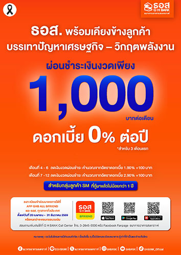 ลูกค้าที่มีความประสงค์เข้าร่วมมาตรการสามารถลงทะเบียนผ่าน Application : GHB ALL BFRIEND ตั้งแต่วันนี้ ถึงวันที่ 31 ธันวาคม 2569 โดยสามารถแสดงหลักฐานการได้รับผลกระทบจากการประกอบอาชีพ / ธุรกิจ / การค้า หรือจากสภาวะทางเศรษฐกิจ เพื่อประกอบการพิจารณาการเข้าร่วมมาตรการด้วย สอบถามรายละเอียดเพิ่มเติมได้ที่ G H BANK Call Center โทร. 0-2645-9000 หรือ Facebook Fanpage ธนาคารอาคารสงเคราะห์ และติดตามข่าวสารของธนาคารได้ที่ G H BANK Social Media ทุกช่องทาง.