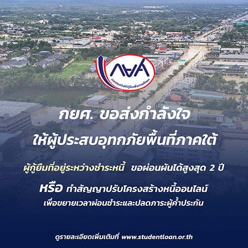 ทั้งนี้ ผู้กู้ยืมสามารถดูรายละเอียดเพิ่มเติมได้ที่ www.studentloan.or.th โดย กยศ. ขอส่งกำลังใจให้ประชาชนในพื้นที่ประสบอุทกภัย รวมถึงเจ้าหน้าที่และจิตอาสาผู้ปฏิบัติงานภาคสนาม ขอให้ทุกท่านปลอดภัยและสถานการณ์คลี่คลายกลับสู่ภาวะปกติโดยเร็ว”.