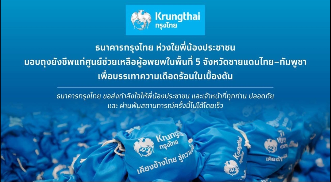 ธนาคารกรุงไทยห่วงใยพี่น้องประชาชนที่ได้รับผลกระทบจากเหตุการณ์ความไม่สงบในพื้นที่ชายแดนไทย-กัมพูชาหลายครอบครัวต้องอพยพจากพื้นที่เสี่ยงอย่างเร่งด่วน เพื่อความปลอดภัย คณะผู้บริหารและพนักงานธนาคารจึงได้เร่งลงพื้นที่ 5 จังหวัดชายแดน ได้แก่ จังหวัดสุรินทร์ บุรีรัมย์ ศรีสะเกษ อุบลราชธานี และ ตราด เพื่อมอบถุงยังชีพพร้อมเครื่องอุปโภคบริโภค และผ้าห่มกันหนาว จำนวนกว่า 6,600 ชุด รวมทั้ง น้ำดื่ม จำนวน 20,000 ขวด บรรเทาความเดือดร้อนในเบื้องต้น