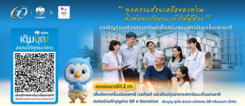 เนื่องในโอกาสครบรอบ 60 ปีกรุงไทย “ทุกก้าว เพื่อล้านอนาคต” ธนาคารกรุงไทย ขอเชิญชวนลูกค้าและประชาชนร่วมเป็นส่วนหนึ่งของ “การให้ที่ยิ่งใหญ่” ด้วยการส่งต่อโอกาสในการเข้าถึงการรักษาที่มีคุณภาพแก่ผู้ป่วยมะเร็ง ผ่านการร่วมบริจาคสนับสนุนสถาบันมะเร็งแห่งชาติ เพื่อนำไปใช้ในการจัดหาเครื่องมือแพทย์ เวชภัณฑ์ และปรับปรุงอาคารสถานที่ เพื่อเพิ่มศักยภาพในการรักษาและรองรับผู้ป่วยได้อย่างมีประสิทธิภาพมากยิ่งขึ้น โดยสามารถร่วมบริจาคได้ที่บัญชี “เงินบริจาคสถาบันมะเร็งแห่งชาติ เพื่อปรับปรุงอาคารสถาบันมะเร็งแห่งชาติ” เลขที่บัญชีออมทรัพย์ 072-0-24444-7 หรือผ่าน “กรุงไทยเติมบุญ” QR e-Donation ซึ่งสามารถนำไปลดหย่อนภาษีได้ 2 เท่า