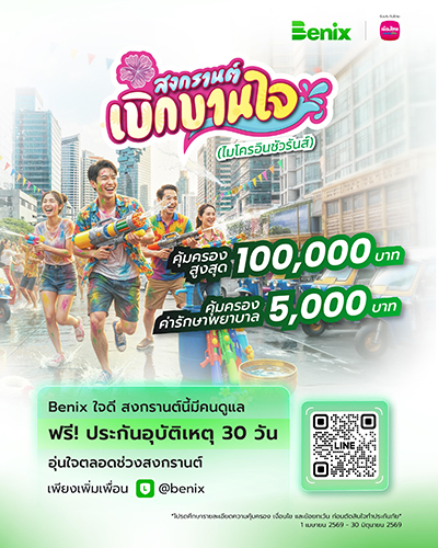 โบรกเกอร์ประกันออนไลน์ ภายใต้ การบริหารของบริษัท เมืองไทย โบรกเกอร์ จำกัด ส่งมอบความอุ่นใจ ผาน “กรมธรรม์ประกันภัยสงกรานต์เบิกบานใจ (ไมโครอินชัวรันส์)” ประกันภัยอุบัติเหตุกลุ่มที่ให้ความคุ้มครองครอบคลุมทั้งด้านชีวิตและค่ารักษาพยาบาลเนื่องจากอุบัติเหตุ วงเงินสูงสุด 100,000 บาท