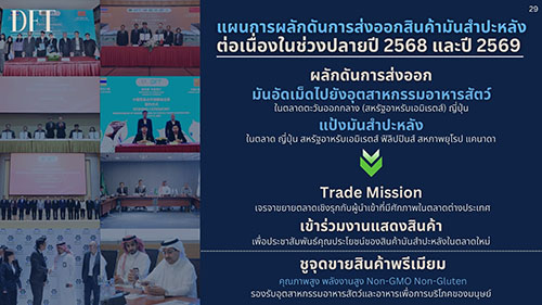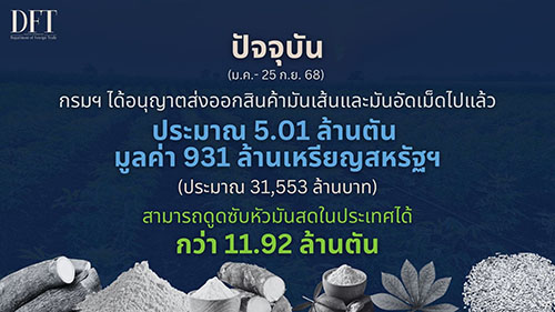 นางอารดา เฟื่องทอง อธิบดีกรมการค้าต่างประเทศ กระทรวงพาณิชย์ กล่าวว่า ในช่วงมกราคม – สิงหาคม 2568 สถานการณ์การส่งออกสินค้ามันสำปะหลังไทยปรับตัวดีขึ้นอย่างต่อเนื่อง จากการเดินหน้าผลักดันขับเคลื่อนการส่งออกมันสำปะหลังไทย ภายใต้นโยบายรัฐบาลที่มุ่งเสริมการขยายตลาดส่งออกไปยังตลาดใหม่ที่มีศักยภาพ ซึ่งจากปริมาณการส่งออกที่เพิ่มขึ้นมาอย่างต่อเนื่องตั้งแต่ต้นปี 2568 เป็นผลจากการดำเนินกิจกรรมขยายตลาดส่งออกมันสำปะหลังของกรมฯ โดยตลอดมา เช่น การจัดคณะผู้แทนภาครัฐและเอกชนไทยเดินทางไปขยายตลาดการค้ามันสำปะหลัง ณ สาธารณรัฐประชาชนจีน และ ซาอุดีอาระเบีย ซึ่งเป็นการกระตุ้นตลาดเดิม และเปิดตลาดใหม่ รวมทั้ง จัดงานประชุมสัมมนามันสำปะหลังโลก ปี 2568 (World Tapioca Conference 2025 : WTC 2025) ครั้งที่ 7 เมื่อวันที่ 29 – 31 กรกฎาคม 2568 ที่ผ่านมา