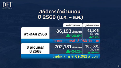 โดย การค้าชายแดนกับประเทศเพื่อนบ้าน 4 ประเทศ เดือนสิงหาคม 2568 มีมูลค่าการค้ารวม 63,938 ล้านบาท (-23.6%) เป็นการส่งออก 33,951 ล้านบาท (-30.1%) การนำเข้า 29,986 ล้านบาท (-14.5%) และ ไทยได้ดุลการค้ารวมทั้งสิ้น 3,965 ล้านบาท โดยการค้าชายแดนกับมาเลเซียมีมูลค่าสูงสุด 26,969 ล้านบาท (-5.7%) รองลงมา คือ สปป.ลาว 23,131 ล้านบาท (-0.1%) เมียนมา 13,827 ล้านบาท (-20.8%) และ กัมพูชา 10 ล้านบาท (-99.9%) ซึ่งสินค้าส่งออกชายแดนสำคัญในเดือนสิงหาคม 2568 ได้แก่ น้ำมันดีเซล 2,051 ล้านบาท เครื่องคอมพิวเตอร์และอุปกรณ์อื่น ๆ 1,350 ล้านบาท และน้ำมันสำเร็จรูปอื่นๆ 1,117 ล้านบาท ทำให้ 8 เดือนแรกของปี 2568 การค้าชายแดนมีมูลค่ารวม 636,219 ล้านบาท (-3.6%) เป็นการส่งออก 377,902 ล้านบาท (-6.7%) และ การนำเข้า 258,317 ล้านบาท (+1.2%)