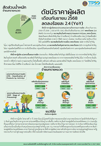 ดัชนีราคาผู้ผลิต เดือนกันยายน 2568 เท่ากับ 108.2 เมื่อเทียบกับเดือนกันยายน 2567 ลดลงร้อยละ 2.4 (YoY) เป็นผลจาก การลดลงของราคาสินค้า หมวดผลิตภัณฑ์เกษตรกรรมและการประมง ลดลงร้อยละ 13.4 จากสินค้าสำคัญ ได้แก่ ผลิตภัณฑ์ทางการเกษตร อาทิ ข้าวเปลือกเจ้า ข้าวเปลือกเหนียว จากฐานราคาของปีก่อนที่สูง ประกอบกับการส่งออกในปีนี้หดตัวค่อนข้างมาก อ้อย จากปริมาณผลผลิตและพื้นที่เพาะปลูกที่เพิ่มขึ้น ข้าวโพดเลี้ยงสัตว์ จากราคาวัตถุดิบอาหารสัตว์ประเภทอื่นปรับตัวลดลง หัวมันสำปะหลังสด จากการส่งออกไปยังประเทศคู่ค้าสำคัญที่ลดลงเมื่อเทียบกับปีที่ผ่านมา ตามความต้องการที่ลดลงในอุตสาหกรรมเกี่ยวเนื่อง ยางพารา จากราคาส่งออกที่ลดลงตามการชะลอคำสั่งซื้อของตลาดปลายทาง พืชผัก (มะนาว ต้นหอม กระเทียม) จากปริมาณผลผลิตที่เพิ่มขึ้นตามสภาพอากาศที่เหมาะสม ผลไม้ (ทุเรียน ลำไย) จากราคาส่งออกในปีนี้ที่หดตัวค่อนข้างมากตามคุณภาพผลผลิตที่ลดลง ไข่ไก่ จากปริมาณผลผลิตที่ออกสู่ตลาดเพิ่มขึ้นตามสภาพอากาศที่เหมาะสม และ โคมีชีวิต จากความต้องการบริโภคที่ลดลงต่อเนื่อง ส่งผลให้ราคาหน้าฟาร์มลดลง