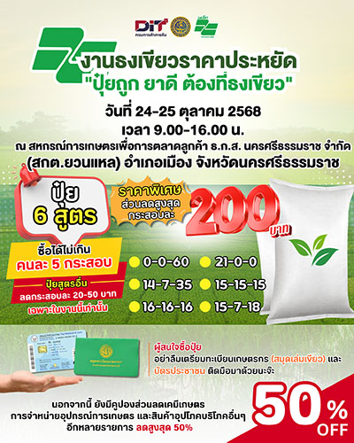 ในส่วนของการลดภาระให้กลุ่มเกษตรกร กรมการค้าภายใน ได้ทำ โครงการธงเขียว โดยเน้นลดราคาปุ๋ย สำหรับปุ๋ย 6 สูตรหลัก ลดราคากระสอบละ 200 บาท โดยเกษตรกรสามารถซื้อได้สูงสุด 5 กระสอบ ลดต้นทุนได้สูงสุด 1,000 บาท ซึ่งได้ดำเนินการแล้วใน 7 จังหวัด มีเกษตรกรเข้าร่วมกว่า 5,102 ราย ซื้อปุ๋ยรวม 25,510 กระสอบ มูลค่า 91 ล้านบาท ช่วยลดต้นทุนเกษตรกรได้กว่า 21 ล้านบาท.