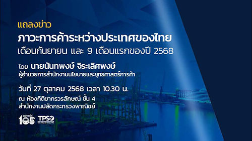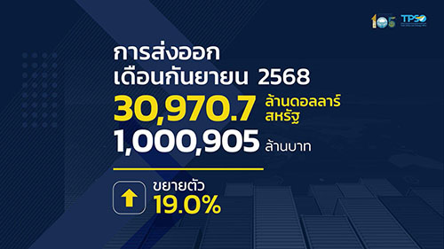 นายนันทพงษ์ จิระเลิศพงษ์ ผู้อำนวยการสำนักงานนโยบายและยุทธศาสตร์การค้า (สนค.) กระทรวงพาณิชย์ แถลงการส่งออกของไทยในเดือนกันยายน 2568 ว่า มีมูลค่า 30,970.7 ล้านดอลลาร์สหรัฐ (1,000,905 ล้านบาท) ขยายตัวต่อเนื่องเป็นเดือนที่ 15 ที่ร้อยละ 19.0 ซึ่งเป็นอัตราการขยายตัวสูงสุดในรอบ 42 เดือน นับตั้งแต่เดือนเมษายน 2565 หากหักสินค้าเกี่ยวเนื่องกับน้ำมัน ทองคำ และยุทธปัจจัย ขยายตัวที่ร้อยละ 15.7