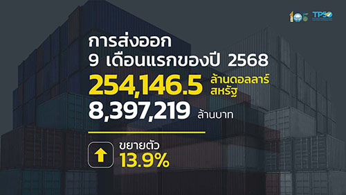 การส่งออกขยายตัวในอัตราเร่งขึ้น ตามความชัดเจนของมาตรการภาษีนำเข้าต่างตอบแทนของสหรัฐฯ ประกอบกับสัญญาณการผ่อนคลายนโยบายการค้าของสหรัฐฯที่เพิ่มมากขึ้น ส่งผลให้ บรรยากาศการค้าโลกฟื้นตัว ทำให้ การส่งออกไปยังตลาดหลักและตลาดรองกลับมาขยายตัวสูง อย่างไรก็ตาม การส่งออกสินค้าเกษตรของไทยยังคงอยู่ในภาวะหดตัว ทั้งนี้ การส่งออก 9 เดือนแรกของปี 2568 ขยายตัวที่ร้อยละ 13.9 หากหักสินค้าเกี่ยวเนื่องกับน้ำมัน ทองคำ และยุทธปัจจัย ขยายตัวที่ร้อยละ 13.6