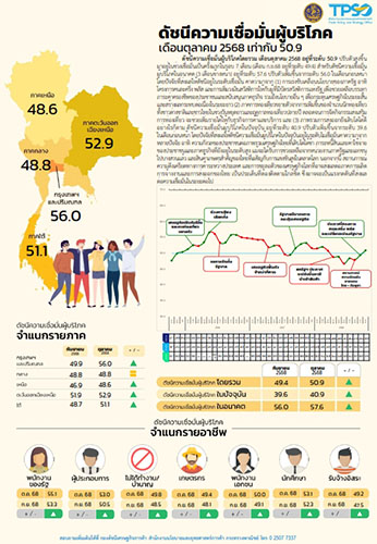ดัชนีความเชื่อมั่นผู้บริโภคโดยรวม เดือนตุลาคม 2568 อยู่ที่ระดับ 50.9 ปรับตัวสูงขึ้นมาอยู่ในช่วงเชื่อมั่นเป็นครั้งแรกในรอบ 7 เดือน (เดือน ก.ย.68 อยู่ที่ระดับ 49.4) สำหรับ ดัชนีความเชื่อมั่นผู้บริโภคในอนาคต (3 เดือนข้างหน้า) อยู่ที่ระดับ 57.6 ปรับตัวเพิ่มขึ้นจากระดับ 56.0 ในเดือนก่อนหน้า โดยปัจจัยที่ส่งผลให้ดัชนีอยู่ในระดับเชื่อมั่น คาดว่า มาจาก…