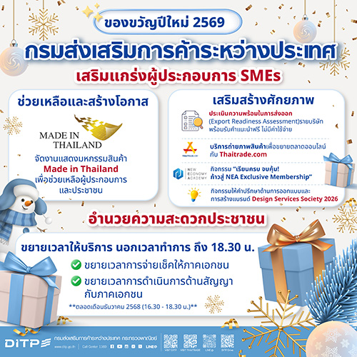 นางสาวสุนันทา กังวาลกุลกิจ อธิบดีกรมส่งเสริมการค้าระหว่างประเทศ (DITP) กระทรวงพาณิชย์ เปิดเผยว่า กรมได้เตรียมของขวัญปีใหม่ต้อนรับปี 2569 ให้กับประชาชน และภาคธุรกิจแบบจัดเต็ม ตามนโยบายที่ได้รับจากกระทรวงพาณิชย์ ที่ให้อำนวยความสะดวกให้กับประชาชนและภาคธุรกิจ โดยได้เปิดบริการใหม่จากใจ DITP ซึ่งเป็นบริการออนไลน์ประเมินความพร้อมในการส่งออก (Export Readiness Assessment) รายบริษัท โดยรับคำแนะนำฟรี ไม่มีค่าใช้จ่าย เริ่มตั้งแต่บัดนี้เป็นต้นไป เพื่อช่วยผู้ประกอบการได้รับทราบระดับความพร้อมในการส่งออกของตนเองและสามารถเลือกบริการหรือเข้าร่วมกิจกรรมด้านการพัฒนาและส่งเสริมการค้าที่มีความเหมาะสมกับศักยภาพของตนเองมากขึ้น