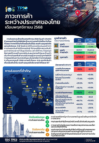นายนันทพงษ์ จิระเลิศพงษ์ ผู้อำนวยการสำนักงานนโยบายและยุทธศาสตร์การค้า (สนค.) กระทรวงพาณิชย์ แถลงการส่งออกของไทยในเดือนพฤศจิกายน 2568 มีมูลค่า 27,445.6 ล้านดอลลาร์สหรัฐ (890,204 ล้านบาท) ขยายตัวต่อเนื่องเป็นเดือนที่ 17 ที่ร้อยละ 7.1 หากหักสินค้าเกี่ยวเนื่องกับน้ำมัน ทองคำ และยุทธปัจจัย ขยายตัวที่ร้อยละ 11.8 การส่งออกยังคงได้รับแรงสนับสนุนหลักจากการส่งออกสินค้าอิเล็กทรอนิกส์ตามวัฏจักรขาขึ้นของคอมพิวเตอร์ และการเติบโตของเทคโนโลยีสมัยใหม่ AI ส่งผลให้ภาพรวมของสินค้าอุตสาหกรรมขยายตัวในระดับสูงอย่างต่อเนื่อง อย่างไรก็ตาม ปัญหาภูมิรัฐศาสตร์ยังคงสร้างความไม่แน่นอนต่อการค้าในระยะข้างหน้า ด้วยสัญญาณการชะลอตัวของตลาดสำคัญ เช่น จีน ญี่ปุ่น CLMV ขณะที่การส่งออกสินค้าเกษตรของไทยยังคงอยู่ในภาวะหดตัวจากภัยพิบัติทางธรรมชาติและการแข่งขันที่รุนแรงในตลาดโลก ทั้งนี้ การส่งออก 11 เดือนแรกของปี 2568 ขยายตัวที่ร้อยละ 12.6 หากหักสินค้าเกี่ยวเนื่องกับน้ำมัน ทองคำ และยุทธปัจจัย ขยายตัวที่ร้อยละ 13.7