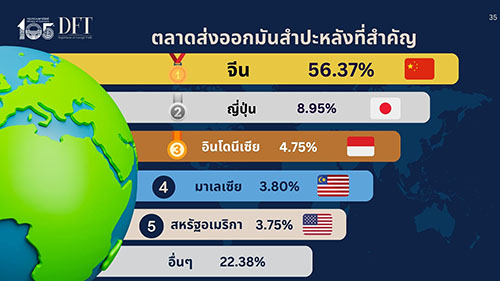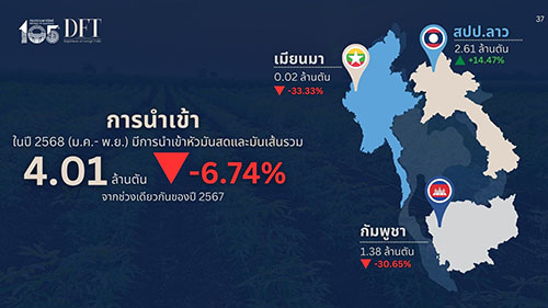 นางอารดา เฟื่องทอง อธิบดีกรมการค้าต่างประเทศ(คต.) กระทรวงพาณิชย์ กล่าวว่า ในช่วงเดือนมกราคม – พฤศจิกายน 2568 สถานการณ์การส่งออกสินค้ามันสำปะหลังไทยปรับตัวดีขึ้นอย่างชัดเจน เป็นผลจากการขับเคลื่อนนโยบายรัฐบาลที่มุ่งเน้นการผลักดันการส่งออกสินค้ามันสำปะหลังไทย โดยการดำเนินกิจกรรมเชิงรุกในการขยายตลาดไปยังประเทศและภูมิภาคใหม่ที่มีศักยภาพ ควบคู่กับการรักษาตลาดหลักเดิมอย่างต่อเนื่อง ซึ่งจากปริมาณการส่งออกที่เพิ่มขึ้นตั้งแต่ต้นปี 2568 เป็นผลจากการดำเนินกิจกรรมขยายตลาดส่งออกมันสำปะหลังของกรมฯ โดยตลอดมา เช่น การจัดคณะผู้แทนภาครัฐและเอกชนไทยเดินทางไปขยายตลาดการค้ามันสำปะหลัง ณ สาธารณรัฐประชาชนจีน ซาอุดีอาระเบีย ญี่ปุ่น และสหรัฐอาหรับเอมิเรตส์ รวมทั้ง จัดงานประชุมสัมมนามันสำปะหลังโลก ปี 2568 (World Tapioca Conference 2025 : WTC 2025) โดยมีผู้ซื้อและผู้ใช้มันสำปะหลังจากหลากหลายภูมิภาคทั่วโลกมาเข้าร่วมงาน ส่งผลให้เกิดมูลค่าการซื้อขายสินค้ามันสำปะหลังภายในงานมากกว่าหมื่นล้านบาท ความสำเร็จดังกล่าวมีส่วนสำคัญในการกระตุ้นตลาดเดิมและเปิดตลาดใหม่ ส่งผลให้การส่งออกสินค้ามันสำปะหลังของไทยขยายตัวได้อย่างมีประสิทธิภาพ