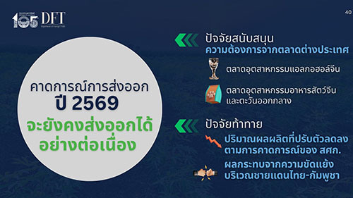 ทั้งนี้ กรมการค้าต่างประเทศคาดการณ์ว่า ในปี 2569 แนวโน้มการส่งออกมันสำปะหลังของไทยจะยังคงอยู่ในทิศทางที่สดใส คาดว่าจะสามารถส่งออกได้อย่างต่อเนื่อง จากปัจจัยสนับสนุนด้านความต้องการของตลาดต่างประเทศ ทั้งในตลาดอุตสาหกรรมแอลกอฮอล์ของจีนซึ่งเป็นตลาดหลักเดิม และตลาดใหม่ที่มีศักยภาพ ได้แก่ อุตสาหกรรมอาหารสัตว์ของจีนและตลาดตะวันออกกลาง โดยเฉพาะซาอุดีอาระเบีย