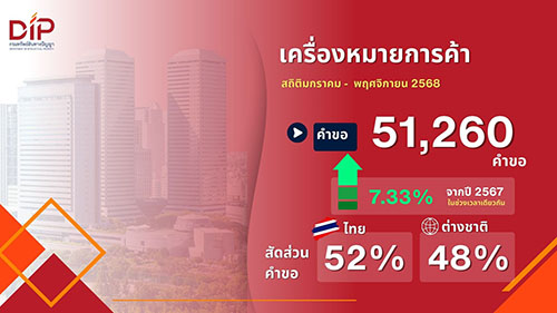 1)เครื่องหมายการค้า มีการยื่นคำขอ 51,260 คำขอ เพิ่มขึ้น 7.33% เมื่อเทียบกับช่วงเวลาเดียวกันในปี 2567 (47,758 คำขอ) สำหรับกลุ่มสินค้าที่มีการยื่นขอรับความคุ้มครองเครื่องหมายการค้ามากที่สุด 5 อันดับแรก ได้แก่ บริการด้านการขายและการตลาด (6,355 คำขอ) ยังคงครองอันดับ 1 ต่อเนื่อง สะท้อนธุรกิจการขายบนแพลตฟอร์มอีคอมเมิร์ซที่เติบโต รองลงมาคือ สินค้าผลิตภัณฑ์ทำความสะอาดและความงาม (6,290 คำขอ) ผลิตภัณฑ์ เพื่อสุขภาพอนามัย (5,450 คำขอ) สะท้อนเทรนด์การค้าที่มุ่งตอบโจทย์ผู้บริโภคยุคใหม่ซึ่งให้ความสำคัญเรื่องการดูแลสุขภาพมากขึ้น ตามมาด้วย เครื่องมือและอุปกรณ์อิเล็กทรอนิกส์ (5,399 คำขอ) และผลิตภัณฑ์เครื่องแต่งกาย (3,830 คำขอ) โดยมีสัดส่วนผู้ยื่นคำขอเครื่องหมายการค้า คนไทย 52% และต่างชาติ 48% สำหรับผู้ยื่นคำขอมากที่สุด 5 อันดับแรก ได้แก่ ป๊อป มาร์ท (สิงคโปร์) โฮลดิ้ง พีทีอี.แอลทีดี (236 คำขอ) สะท้อนกระแสความนิยมของสินค้าอาร์ตทอยที่ยังคงแรงไม่ตกในไทย รองลงมาคือบริษัท เดอะ เกรท ไอเดีย จำกัด ในกลุ่มสินค้างานกราฟิก (108 คำขอ) บริษัท คอสมี่ จำกัด ในกลุ่มสินค้าเครื่องมือแพทย์ (103 คำขอ) เอ็มซี โอ (ไอพี) โฮลดิ้งส์ ลิมิเต็ด ในกลุ่มสินค้าเอ็นเตอร์เทนเมนต์คอมเพล็กซ์ (92 คำขอ) และเอสเอ็ม เอนเตอร์เทนเมนท์ โค.,แอลทีดี ในกลุ่มสินค้าคาแรคเตอร์ (78 คำขอ) ทั้งนี้ ตัวเลขการจดทะเบียนเครื่องหมายการค้า ในช่วง 11 เดือนแรกของปี 2568 อยู่ที่ 37,567 เครื่องหมาย เพิ่มขึ้น 41.52% เมื่อเทียบกับช่วงเวลาเดียวกันในปี 2567 (26,545 เครื่องหมาย)