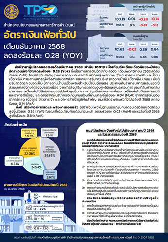 นายนันทพงษ์ จิระเลิศพงษ์ ผู้อำนวยการสำนักงานนโยบายและยุทธศาสตร์การค้า (ผอ.สนค.) โฆษกกระทรวงพาณิชย์ เผยว่า ดัชนีราคาผู้บริโภคทั่วไปของไทย เดือนธันวาคม 2568 เท่ากับ 100.19 เมื่อเทียบกับเดือนธันวาคม 2567 ซึ่งเท่ากับ 100.47 ทำให้อัตราเงินเฟ้อทั่วไปลดลงร้อยละ 0.28 (YoY) เป็นการลดลงในอัตราที่ชะลอตัว (เดือนพฤศจิกายน 2568 ลดลงร้อยละ 0.49) โดยมีปัจจัยสำคัญจากการลดลงของราคาสินค้าในกลุ่มพลังงาน ได้แก่ ค่ากระแสไฟฟ้า และน้ำมันเชื้อเพลิง ตามสถานการณ์พลังงานในตลาดโลก รวมถึงมติของคณะกรรมการบริหารกองทุนน้ำมันเชื้อเพลิง (กบน.) ในการปรับลดอัตราเงินจัดเก็บเข้ากองทุนน้ำมันเชื้อเพลิงสำหรับน้ำมันดีเซล ประกอบกับราคาสินค้าในกลุ่มของใช้ส่วนบุคคลยังปรับลดลงอย่างต่อเนื่อง จากการส่งเสริมการตลาดของผู้ผลิตและผู้ประกอบการ อย่างไรก็ตาม ราคาสินค้าในกลุ่มอาหาร และเครื่องดื่มไม่มีแอลกอฮอล์ปรับตัวสูงขึ้น จากการสูงขึ้นของราคาผักสด เครื่องดื่มไม่มีแอลกอฮอล์ และอาหารสำเร็จรูป สำหรับราคาสินค้าและบริการอื่นๆ ส่งผลกระทบต่อภาวะเงินเฟ้อไม่มากนัก