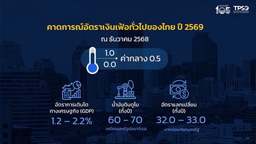 สำหรับทั้งปี 2569 คาดว่าอัตราเงินเฟ้อทั่วไปจะอยู่ในช่วงร้อยละ 0.0 – 1.0 (ค่ากลางร้อยละ 0.5) ปรับตัวสูงขึ้นจากปี 2568 ที่ลดลงร้อยละ 0.14 โดยมีปัจจัยสนับสนุนจากราคาสินค้าเกษตรที่มีแนวโน้มปรับตัวสูงขึ้นภายใต้นโยบายรักษาเสถียรภาพราคาสินค้าเกษตร รวมถึงการฟื้นตัวของภาคการท่องเที่ยว ซึ่งส่งผลให้ราคาสินค้าและบริการที่เกี่ยวเนื่องปรับตัวสูงขึ้น อย่างไรก็ตาม ยังมีปัจจัยท้าทายที่ต้องติดตามอย่างใกล้ชิด ได้แก่ ราคาน้ำมันดิบในตลาดโลกอยู่ในระดับต่ำกว่าปีก่อนหน้า การแข็งค่าของเงินบาทอย่างต่อเนื่องและเร็วกว่าประเทศอื่นในภูมิภาค การขยายตัวทางเศรษฐกิจไทยและเศรษฐกิจโลกที่อยู่ในระดับต่ำ และความไม่แน่นอนของสถานการณ์ความขัดแย้งทางภูมิรัฐศาสตร์ในหลายพื้นที่และหลายมิติ รวมถึงความเสี่ยงจากภัยพิบัติทางธรรมชาติอันเป็นผลจากการเปลี่ยนแปลงสภาพภูมิอากาศ ซึ่งอาจสร้างความเสียหายต่อรายได้เป็นวงกว้าง และส่งผลกระทบต่อเงินเฟ้ออย่างมีนัยสำคัญ.