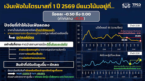 ทั้งนี้ สนค.มองแนวโน้มอัตราเงินเฟ้อทั่วไปของไทยในไตรมาสที่ 1 ปี 2569 คาดว่าจะยังคงลดลง อยู่ระหว่างร้อยละ (-0.5) – 0.0 (ค่ากลางร้อยละ -0.25) โดยมีปัจจัยสำคัญจากฐานราคาน้ำมันที่อยู่ในระดับต่ำกว่าช่วงเดียวกันของปีก่อน ประกอบกับอุปสงค์ทางเศรษฐกิจยังอ่อนแอ เนื่องจากไม่มีมาตรการกระตุ้นเศรษฐกิจในช่วงการเลือกตั้ง อย่างไรก็ตาม สินค้าบางชนิดมีแนวโน้มปรับตัวสูงขึ้น โดยเฉพาะผักสด จากผลผลิตที่ได้รับความเสียหายจากภัยพิบัติทางธรรมชาติ โดยคาดว่าสถานการณ์จะดีขึ้นในระยะต่อไป จากการดำเนินมาตรการกระตุ้นเศรษฐกิจของภาครัฐภายหลังการเลือกตั้ง การฟื้นตัวของภาคการท่องเที่ยว และการเร่งเบิกจ่ายงบประมาณภาครัฐ