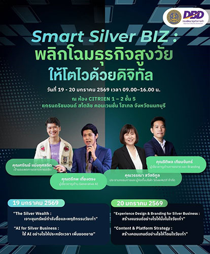 นายพูนพงษ์ นัยนาภากรณ์ อธิบดีกรมพัฒนาธุรกิจการค้า(DBD) กระทรวงพาณิชย์ เปิดเผยว่า ได้มอบหมายให้ นายสถาพร ร่วมนาพะยา รองอธิบดีกรมพัฒนาธุรกิจการค้า เป็นประธานเปิดการอบรม ‘Smart Silver BIZ : พลิกโฉมธุรกิจสูงวัยให้โตไวด้วยดิจิทัล’ ณ โรงแรมแกรนด์ริชมอนด์ สไตลิช คอนเวนชั่น โฮเทล จัดขึ้นระหว่างวันที่ 19-20 มกราคม 2569 ซึ่งโครงการฯ ดังกล่าวจัดขึ้นเพื่อให้ผู้ประกอบการมีภูมิคุ้มกันทางธุรกิจที่เข้มแข็งทั้ง ‘รอด’ และ ‘รุ่ง’ ในสมรภูมิธุรกิจปี 2569 ที่คาดว่าจะมีการแข่งขันที่เข้มข้นมากยิ่งขึ้น ผู้ประกอบการจึงจำเป็นต้องปรับตัวอย่างรอบด้าน โดยเฉพาะ 3 หัวใจสำคัญหลักที่ผู้ประกอบการยุคใหม่ต้องมี ได้แก่ (1) ความเชื่อมั่น ซึ่งถือเป็นต้นทุนที่มีค่าที่สุดในธุรกิจสุขภาพและการดูแลผู้สูงอายุ ผู้ประกอบการต้องสร้างมาตรฐานความปลอดภัยที่ตรวจสอบได้ และให้บริการที่ลูกค้าวางใจได้อย่างแท้จริง (2) เทคโนโลยีผสานหัวใจบริการ อย่านำดิจิทัลมาแค่โพสต์ขายของ แต่ใช้ AI วิเคราะห์ลูกค้า บริหารระบบหลังบ้าน เปลี่ยนบริการธรรมดาให้เป็นบริการที่ ‘รู้ใจ’ (3) ความไวและความเข้าใจลูกค้า ผู้สูงวัยยุคใหม่ หรือ ‘Yold’ (Young Old) มีไลฟ์สไตล์ที่เปลี่ยนไป ไฮเทคขึ้น และต้องการมากกว่าการรักษาโรค แต่ต้องการ ‘ความสุข’ และ ‘ความมั่นใจ’ ผู้ประกอบการต้องใช้ข้อมูล (Data) ตีโจทย์ให้แตกว่าจะเข้าไปเติมเต็มชีวิตเขาได้อย่างไร