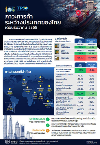 สนค.เผย! ยอดส่งออกธันวาคม 2568 ขยายตัวต่อเนื่องเดือนที่ 18 จากแรงหนุนอุตสาหกรรมเทคโนโลยีและอิเล็กทรอนิกส์ รับเทรนด์ AI รวมถึงการย้ายฐานห่วงโซ่อุปทานโลก ระบุ! ทั้งปี 2568 ส่งออกทำมูลค่าสูงสุดเป็นประวัติการณ์กว่า 11 ล้านล้านบาท ห่วงปี 2569 อาจเผชิญความเสี่ยงปมภูมิรัฐศาสตร์ ค่าเงินบาทแข็ง และความไม่แน่นอนของเศรษฐกิจโลก