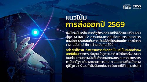 เบื้องต้น สนค.คาดการณ์การส่งออกปี 2569 ไว้ในกรอบติดลบร้อยละ 3 ถึงขยายตัวร้อยละ 1.1 โดยหากเศรษฐกิจโลกฟื้นตัวเร็วกว่าคาด โอกาสที่การส่งออกไทยจะกลับมาเป็นบวกยังมีอยู่ แต่หากสถานการณ์โลกยังผันผวน การส่งออกอาจเผชิญแรงกดดันต่อเนื่อง ซึ่งจำเป็นต้องติดตามพัฒนาการอย่างใกล้ชิดตลอดทั้งปี.
