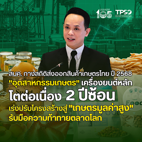 ผอ.สนค. กล่าวทิ้งท้ายว่า แม้ภาพรวมการส่งออกสินค้าเกษตรและอุตสาหกรรมเกษตรของไทยจะหดตัวเล็กน้อยที่ 0.4% แต่พบสัญญาณบวกที่สำคัญจากการปรับตัวของสินค้าไทยสู่สินค้าที่มีมูลค่าสูงขึ้น โดยเฉพาะสินค้าอุตสาหกรรมเกษตรที่ยังคงขยายตัวต่อเนื่องเป็นปีที่ 2 สะท้อนถึงทิศทางการยกระดับโครงสร้างการส่งออกสินค้าของไทย ทั้งนี้ ควรเร่งผลักดันสินค้าเกษตรที่ตอบโจทย์เทรนด์ตลาดโลกควบคู่ไปกับการกระจายความเสี่ยงด้านสินค้าและตลาด (Diversification) เพื่อลดการพึ่งพาตลาดใดตลาดหนึ่งมากเกินไป และสร้างภูมิคุ้มกัน ให้ภาคเกษตรไทยเติบโตอย่างแข็งแกร่งและมั่นคงในเวทีการค้าโลก.