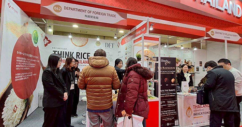 ในงาน FOODEX JAPAN 2026 กรมฯ ได้ร่วมจัดกิจกรรมใน Thailand Pavilion ของสำนักงานส่งเสริมการค้าในต่างประเทศ (สคต.) ณ กรุงโตเกียว กรมส่งเสริมการค้าระหว่างประเทศ ซึ่งในคูหาของกรมการค้าต่างประเทศได้จัดแสดงตัวอย่างข้าวไทยชนิดต่างๆ ประกอบด้วย ข้าวหอมมะลิไทย ข้าวหอมไทย ข้าวขาว ข้าวเหนียว ข้าวไรซ์เบอร์รี่ ข้าวสังข์หยด และข้าวหอมนิล เพื่อนำเสนอความหลากหลายของข้าวไทยที่มีคุณภาพและมาตรฐานเป็นที่ยอมรับในระดับสากล ควบคู่กับการสร้างการจดจำเกี่ยวกับเครื่องหมายรับรองข้าวหอมมะลิไทย พร้อมทั้งแจกสื่อประชาสัมพันธ์ต่างๆ ได้แก่ แผ่นพับและใบปลิว เพื่อให้ความรู้เกี่ยวกับมาตรฐานข้าวไทย เครื่องหมายรับรองข้าวหอมมะลิไทย ความหลากหลายข้าวไทย และข้าวไรซ์เบอร์รี่ พร้อมของที่ระลึกที่มีโลโก้กรม และเครื่องหมายรับรองข้าวหอมมะลิไทย เพื่อสร้างการรับรู้และจดจำ