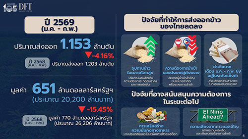 นางอารดา เฟื่องทอง อธิบดีกรมการค้าต่างประเทศ(คต.) กระทรวงพาณิชย์ เปิดเผยสถิติการส่งออกข้าวของไทยในช่วงเดือนมกราคม – กุมภาพันธ์ 2569 ว่าไทยสามารถส่งออกข้าวได้ประมาณ 1.153 ล้านตัน ลดลง 4.16% และมีมูลค่ากว่า 651 ล้านดอลลาร์สหรัฐฯ (ประมาณ 20,200 ล้านบาท) ลดลง 15.45% เมื่อเทียบกับช่วงเดียวกันของปีก่อน ซึ่งเป็นผลจากปริมาณข้าวในตลาดโลกที่อยู่ในระดับสูง ส่งผลให้การแข่งขันด้านราคามีความรุนแรงมากขึ้น รวมถึงนโยบายจำกัดการนำเข้าของประเทศผู้นำเข้าสำคัญ เช่น อินโดนีเซีย และฟิลิปปินส์ สำหรับค่าเงินบาทที่ปัจจุบันแม้เริ่มอ่อนค่าลง แต่ยังถือว่าอยู่ในระดับที่ค่อนข้างแข็งค่าเมื่อเทียบกับผู้ส่งออกรายอื่นส่งผลต่อความสามารถในการแข่งขันด้านราคาส่งออกของข้าวไทย