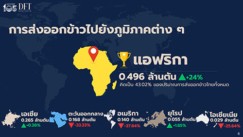 อธิบดีกรมการค้าต่างประเทศ กล่าวเพิ่มเติมว่า แม้ตัวเลขส่งออกข้าวไทยในช่วง 2 เดือนแรกจะปรับตัวลดลงจากแรงกดดันของตลาดโลก แต่จากสถิติการส่งออกข้าวพบว่า ในขณะที่ข้าวชนิดต่างๆ เช่น ข้าวขาว ข้าวหอมมะลิไทย ข้าวหอมไทย และข้าวเหนียว มีปริมาณส่งออกลดลง แต่ข้าวนึ่ง กลับขยายตัวกว่า 40% เมื่อเทียบกับช่วงเดียวกันของปีก่อน สะท้อนถึงความต้องการที่เพิ่มขึ้นในตลาดแอฟริกา เพื่อเพิ่มความมั่นคงทางอาหารท่ามกลางความไม่แน่นอนของสถานการณ์ความตึงเครียดในภูมิภาคตะวันออกกลาง อีกทั้ง ไทยยังส่งออกข้าวไปตลาดสำคัญอย่างแอฟริกาใต้ มาเลเซีย และฟิลิปปินส์ ได้เพิ่มขึ้น