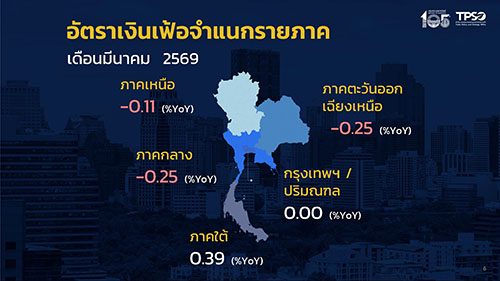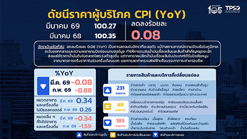 นายนันทพงษ์ จิระเลิศพงษ์ ผู้อำนวยการสำนักงานนโยบายและยุทธศาสตร์การค้า (ผอ.สนค.) โฆษกกระทรวงพาณิชย์ เผยว่า ดัชนีราคาผู้บริโภคทั่วไปของไทย เดือนมีนาคม 2569 เท่ากับ 100.27 เมื่อเทียบกับเดือนมีนาคม 2568 ซึ่งเท่ากับ 100.35 ทำให้อัตราเงินเฟ้อทั่วไปลดลงร้อยละ 0.08 (YoY) เป็นการปรับลดลงในอัตราที่ชะลอตัว แม้จะมีสถานการณ์ความขัดแย้งในภูมิภาตะวันออกกลางและความพยายามปิดช่องแคบฮอร์มุซที่ส่งผลให้การขนส่งน้ำมันเชื้อเพลิงและสินค้าสำคัญหยุดชะงัก และทำให้ราคาน้ำมันดิบในตลาดโลกเร่งตัวสูงขึ้น อย่างไรก็ตาม ราคาขายปลีกน้ำมันเชื้อเพลิงในประเทศยังถูกจำกัดการปรับเพิ่มขึ้นจากมาตรการตรึงราคาในช่วงครึ่งเดือนแรก และการปรับลดค่ากระแสไฟฟ้ายังคงช่วยบรรเทาภาระค่าครองชีพ ประกอบกับสินค้าส่วนใหญ่ยังเป็นสต็อกเดิม จึงยังไม่มีการปรับขึ้นราคาในเดือนมีนาคม ขณะที่ราคาสินค้าในกลุ่มอาหารและเครื่องดื่มไม่มีแอลกอฮอล์ปรับตัวสูงขึ้น จากเครื่องดื่มไม่มีแอลกอฮอล์ และอาหารสำเร็จรูป สำหรับราคาสินค้าและบริการอื่นๆ ส่งผลกระทบต่อภาวะเงินเฟ้อไม่มากนัก