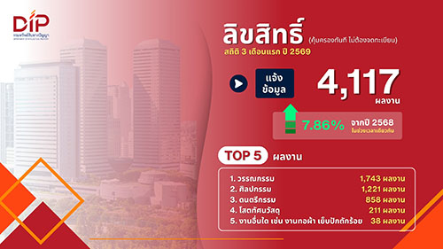 5) ลิขสิทธิ์ ช่วง 3 เดือนแรกของปี 2569 มีการยื่นแจ้งข้อมูล 4,117 ผลงาน เพิ่มขึ้น 7.86% เมื่อเทียบกับช่วงเดียวกันในปี 2568 (3,817 ผลงาน) ผลงานที่มีการแจ้งข้อมูลลิขสิทธิ์มากที่สุด 5 อันดับแรก ได้แก่ (1) วรรณกรรม เช่น งานนิพนธ์ โปรแกรมคอมพิวเตอร์ 1,743 ผลงาน (2) ศิลปกรรม เช่น งานจิตรกรรม ประติมากรรม ภาพพิมพ์ 1,221 ผลงาน (3) ดนตรีกรรม 858 ผลงาน (4) โสตทัศนวัสดุ 211 ผลงาน และ (5) งานอื่นใด เช่น งานทอผ้า งานเย็บปักถักร้อย 38 ผลงาน โดยมีสัดส่วนผู้ยื่นแจ้งข้อมูลผลงานลิขสิทธิ์ คนไทย 99% และต่างชาติ 1% สำหรับผู้ยื่นแจ้งข้อมูลมากที่สุด 5 อันดับแรก ได้แก่ (1) มหาวิทยาลัยมหิดล 117 ผลงาน (2) มหาวิทยาลัยทักษิณ 110 ผลงาน (3) บริษัท ยอวานี จำกัด ของไทย 61 ผลงาน (4) มหาวิทยาลัยขอนแก่น 59 ผลงาน และ (5) นายศุภวุฒิ สูงสว่าง 49 ผลงาน ทั้งนี้ ลิขสิทธิ์เป็นทรัพย์สินทางปัญญาที่ได้รับความคุ้มครองทันทีที่สร้างสรรค์ โดยไม่ต้องยื่นจดทะเบียนกับกรม สถิติดังกล่าวจึงไม่สามารถสะท้อนภาพรวมของงานสร้างสรรค์ไทยได้ทั้งหมด อย่างไรก็ดี กรมจะเดินหน้าส่งเสริมให้ศิลปินนักสร้างสรรค์เห็นความสำคัญของการแจ้งข้อมูลลิขสิทธิ์กับกรม เพื่อเป็นหลักฐานอ้างอิงเบื้องต้นในการแสดงความเป็นเจ้าของลิขสิทธิ์ในกรณีที่เกิดข้อพิพาท รวมทั้งเป็นช่องทางให้ผู้อื่นสามารถเข้าถึงผลงานและติดต่อขอใช้ประโยชน์งานลิขสิทธิ์นั้นได้ง่ายขึ้น