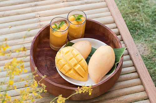 สำหรับ “มะม่วงน้ำดอกไม้สีทองบ้านแฮดขอนแก่น” ที่ถูกนำมาใช้ในงานสำคัญครั้งนี้ เป็นมะม่วง GI ที่มีเอกลักษณ์เฉพาะ ปลูกในพื้นที่ครอบคลุม 5 อำเภอ ใน 3 จังหวัด ได้แก่ จังหวัดขอนแก่น (อำเภอบ้านแฮด เปือยน้อย และบ้านไผ่) จังหวัดนครราชสีมา (อำเภอบัวลาย) และจังหวัดมหาสารคาม (อำเภอโกสุมพิสัย) โดยพื้นที่ดังกล่าวมีลักษณะเป็นที่ราบ มีเทือกเขาและภูเขาน้อยใหญ่ล้อมรอบ มีแหล่งน้ำธรรมชาติขนาดใหญ่คือลุ่มน้ำมูลและลุ่มน้ำชี ลักษณะภูมิอากาศมีฝนตกสลับแห้งแล้ง ดินเป็นดินร่วนปนทรายหรือดินทรายที่ระบายน้ำได้ดีและอุดมไปด้วยธาตุอาหารสำคัญ เช่น โพแทสเซียมและฟอสฟอรัส ซึ่งเกิดจากการสลายตัวของหินและอินทรียวัตถุ ดินจึงเหมาะกับการปลูกมะม่วงอย่างยิ่ง เพราะเป็นพืชที่ใช้น้ำน้อยและเจริญเติบโตได้ดีในดินลักษณะนี้ ส่งผลให้มะม่วงน้ำดอกไม้สีทองบ้านแฮดขอนแก่น มีผลขนาดใหญ่ เปลือกบาง ผลที่สุกจะมีผิวสีเหลืองทอง เนื้อแน่นสีเหลืองเข้ม ไม่มีเสี้ยน และรสชาติหวานหอม เป็นที่ต้องการของตลาดทั้งในและต่างประเทศ โดยมีตลาดส่งออกสำคัญ เช่น เกาหลี ญี่ปุ่น และจีน เป็นต้น